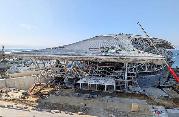 «Один из самых конструктивно сложных элементов театра — парящая консоль, общественное пространство, доступное без посещения спектаклей. Это уникальная смотровая площадка с выдающейся в сторону моря открытой эксплуатируемой террасой с вылетом более 35 метров, нависающей над уровнем земли более чем на 15 метров. Конструкция станет не просто террасой на морском берегу, но и «спрячет» внутри помещения для артистов, гримерные и костюмерные. Сама консоль состоит из ферм, которые по отдельности имеют вес до 300 тонн, а вся конструкция весит 2118 тонн: такой длины и такого веса фермы в России еще не монтировали. Сложность заключается в том, что часть кровли и опоясывающих металлоконструкций опираются как раз на парящую консоль. То есть необходимо было произвести такие расчеты и спроектировать все таким образом, чтобы эта консоль не только свой собственный вес удерживала, но и стоящие на ней конструкции», — делятся подробностями севастопольские эксперты.
